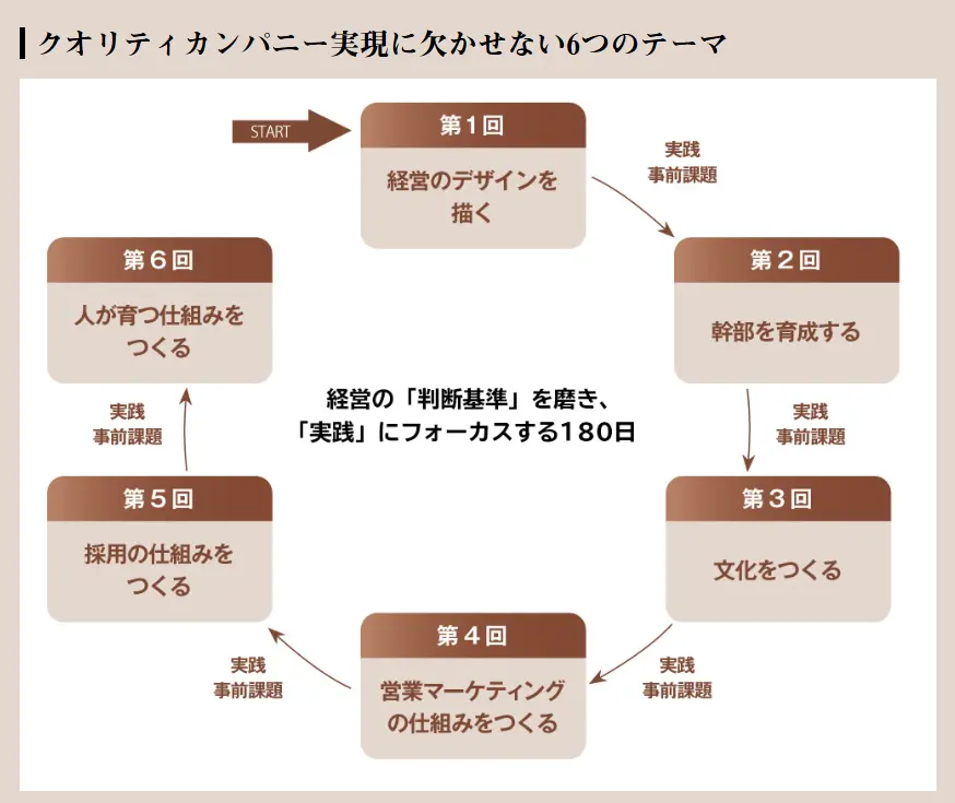 半年間の講座は、経営における6つの主要テーマを体系的に学び、理想の経営デザインを描きながら、自社の課題を実践的に改善していきます。