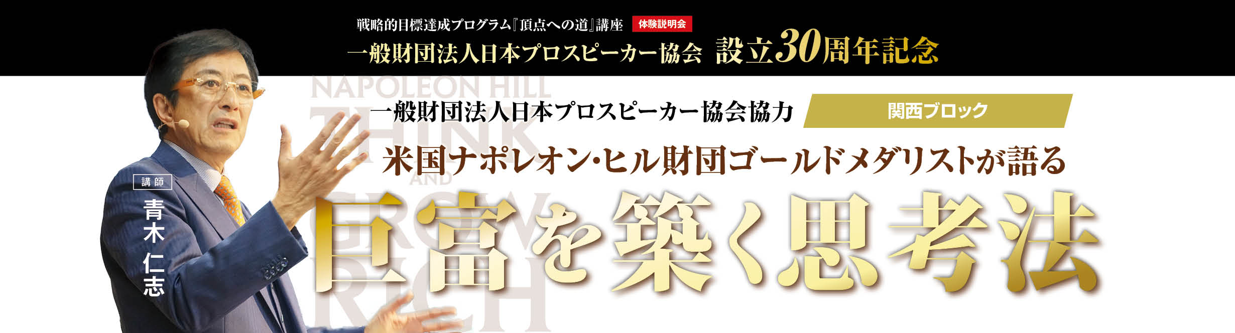 今回青木が受賞したナポレオン・ヒル財団のゴールドメダルは『THINK AND GROW RICH』の著者であるナポレオン・ヒル博士の成功哲学を実践し、社会に大きな貢献を果たした人物に授与される賞です。青木は若くから成功哲学を活用し、会社設立以来、延べ53万名の人財育成と、1万名を超える中小企業経営者教育に従事してきました。多くの経営者・ビジネスリーダーを育成してきた実績が評価され今回の受賞に至りました。