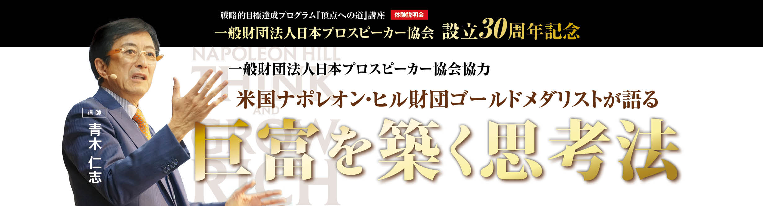 今回青木が受賞したナポレオン・ヒル財団のゴールドメダルは『THINK AND GROW RICH』の著者であるナポレオン・ヒル博士の成功哲学を実践し、社会に大きな貢献を果たした人物に授与される賞です。青木は若くから成功哲学を活用し、会社設立以来、延べ53万名の人財育成と、1万名を超える中小企業経営者教育に従事してきました。多くの経営者・ビジネスリーダーを育成してきた実績が評価され今回の受賞に至りました。