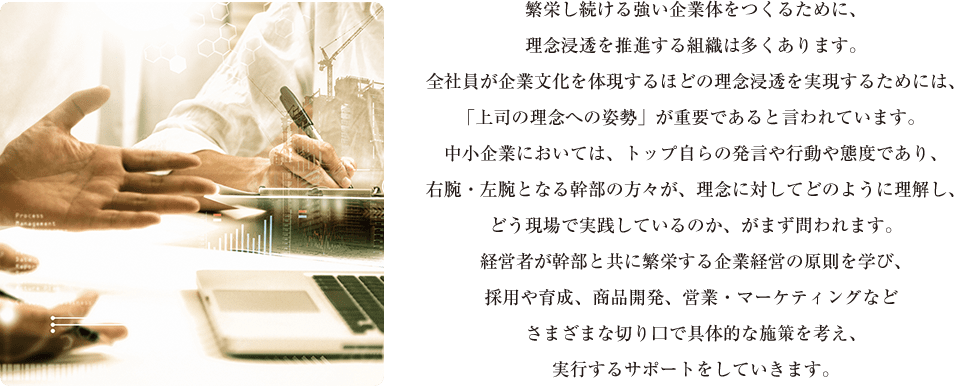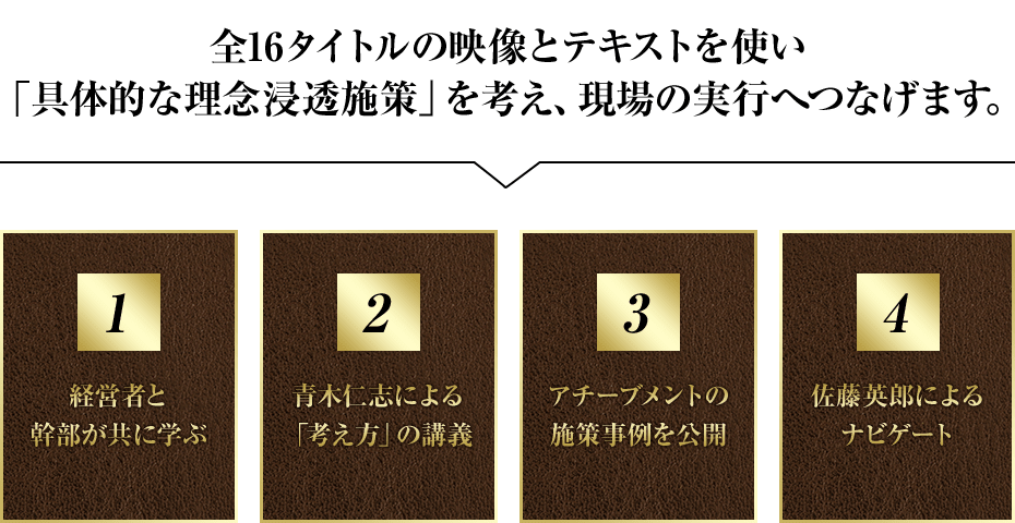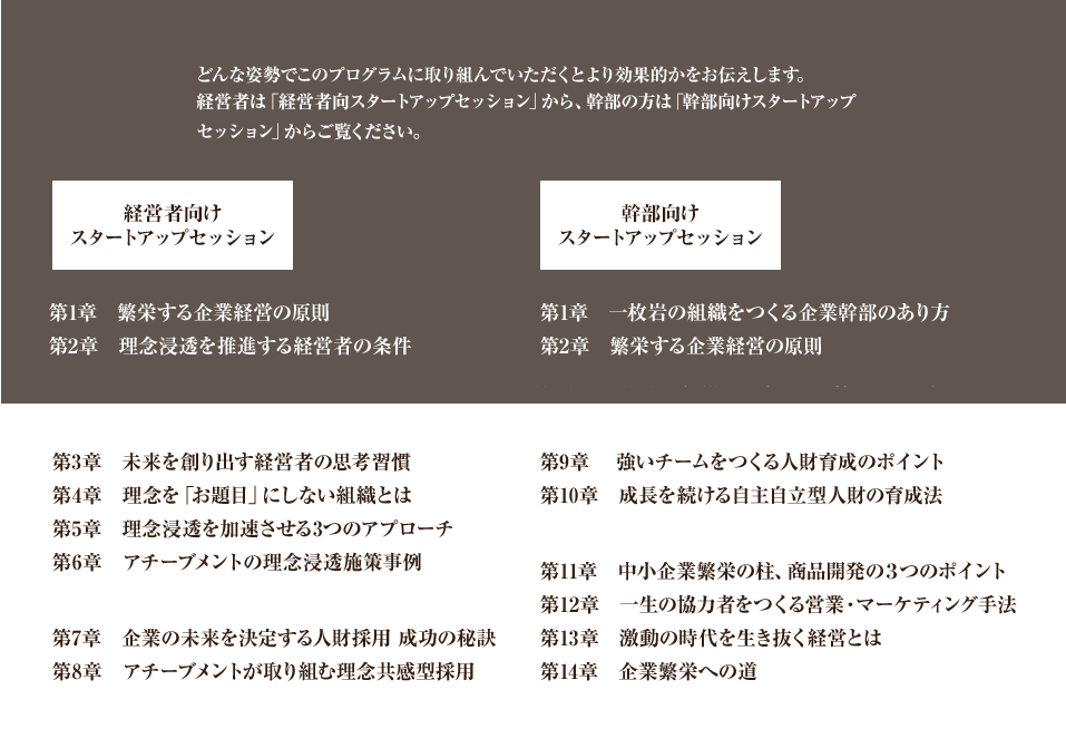 本プログラムでは、1万名の中小企業経営者教育に従事してきた代表青木が全14章を解説。理念浸透の極意を余すことなくお届けします。